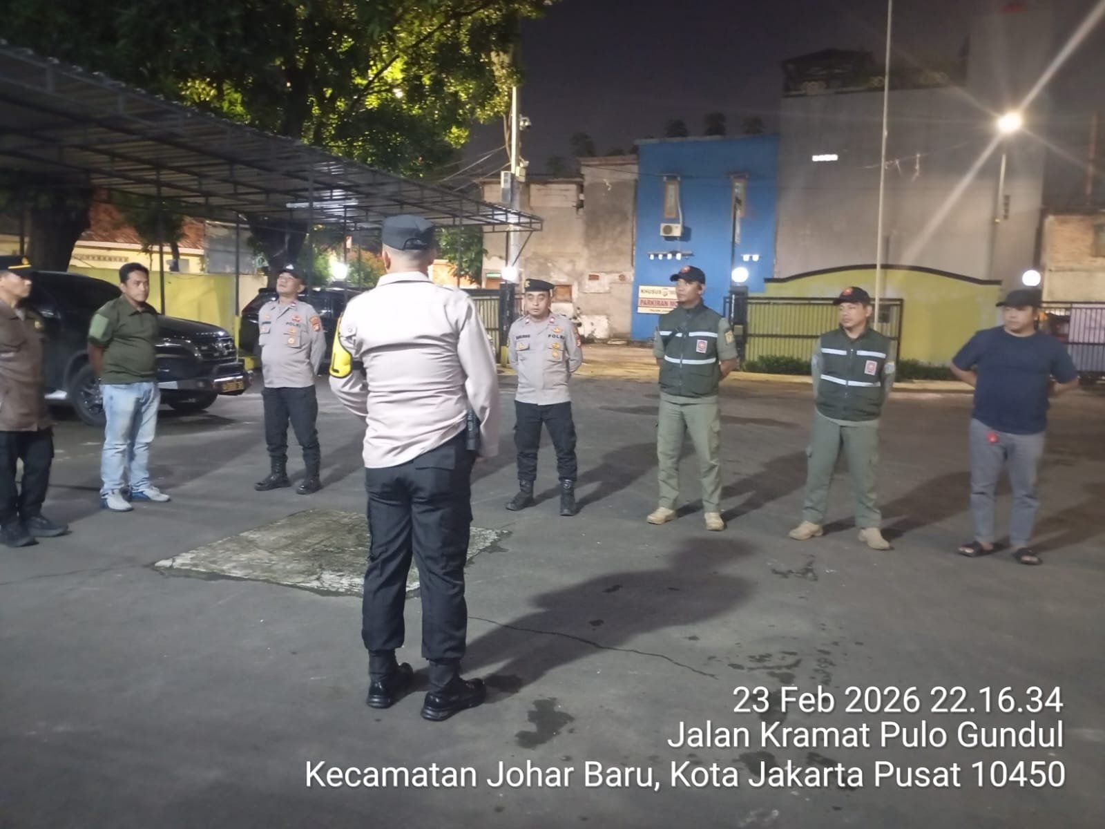 Harmoninews.com (Jakarta Pusat) – Untuk mengantisipasi gangguan keamanan dan ketertiban masyarakat (guantibmas) selama bulan suci Ramadhan, Polsek Johar Baru menggelar Apel Patroli Gabungan Tiga Pilar di halaman Polsek Johar Baru, Senin (23/2/2026) pukul 22.15 WIB.