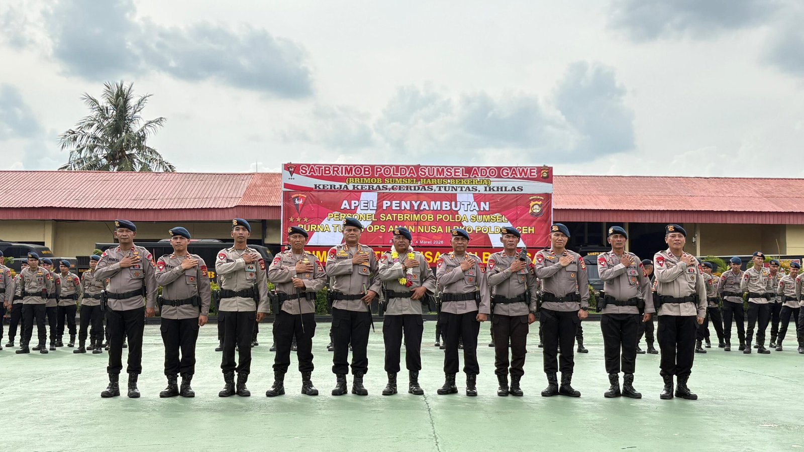 Harmoninews.com (Palembang) — Komandan Satuan Brimob Polda Sumatera Selatan Kombes Pol. Susnadi, S.I.K., memimpin langsung upacara penyambutan personel Satbrimob yang telah menyelesaikan tugas dalam Operasi Aman Nusa II BKO Polda Aceh.