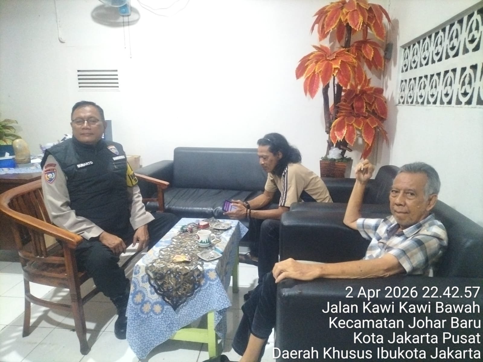 Kegiatan tersebut dilaksanakan oleh Aiptu Sunarto selaku Bhabinkamtibmas Kelurahan Johar Baru dengan menyambangi warga dan tokoh lingkungan setempat. Dalam kesempatan tersebut, petugas bertemu dengan Edi selaku Ketua RT 01/RW 08 serta Mulyono selaku staf RW 08 guna menjalin komunikasi serta bertukar informasi terkait kondisi keamanan wilayah.