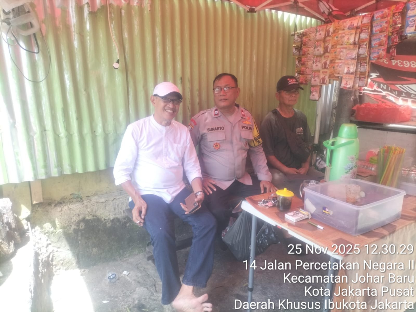 Harmoninews.com (Jakarta Pusat) – Bhabinkamtibmas Kelurahan Johar Baru, Aiptu Sunarto, melaksanakan patroli dialogis dan sambang door to door di RW 06 Jl. Percetakan Negara II, Selasa (25/11/2025) pukul 12.30 WIB. Dalam kegiatan ini, petugas bertemu warga Bpk. Welli dan Ketua RW 06 Bpk. Cahyadi untuk memastikan situasi tetap kondusif.