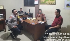 Harmoninews.com (Jakarta Pusat) – Upaya menjaga stabilitas keamanan terus dilakukan jajaran Polsek Johar Baru melalui kegiatan cooling system, patroli wilayah, dan door to door system (DDS) sambang warga. Kegiatan tersebut berlangsung pada Rabu malam, 22 April 2026, pukul 20.30 WIB di Sekretariat RW 06, Jalan Percetakan Negara II, Kelurahan Johar Baru, Kecamatan Johar Baru, Jakarta Pusat.