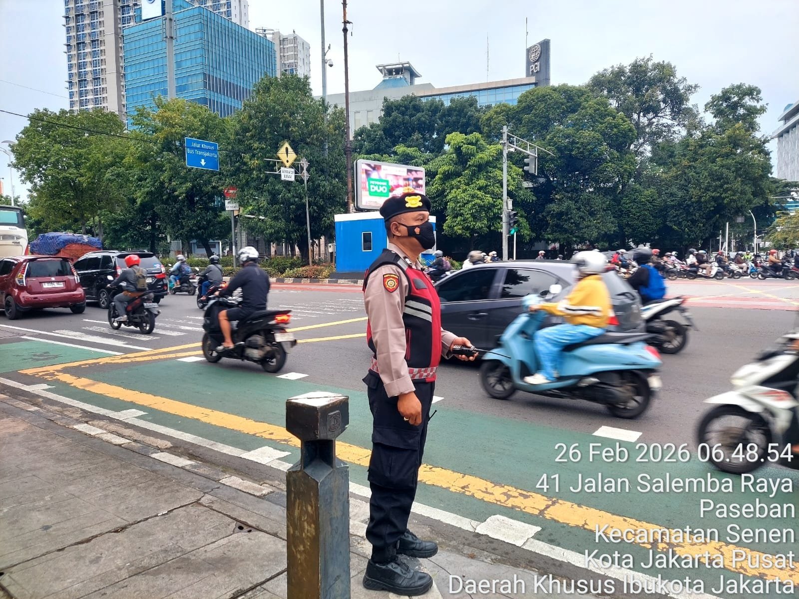 Sementara itu, pada pukul 06.50 WIB dan kembali pada pukul 07.00 WIB, pengaturan lalu lintas juga dilakukan di kawasan Simpang Lima Senen. Personel Samapta, di antaranya Aiptu D. Kurniawan selaku Panit 1 Samapta Unit Senen dan Bripka Andika, tampak membantu kelancaran arus kendaraan sekaligus memberikan pelayanan kepada pengguna jalan.