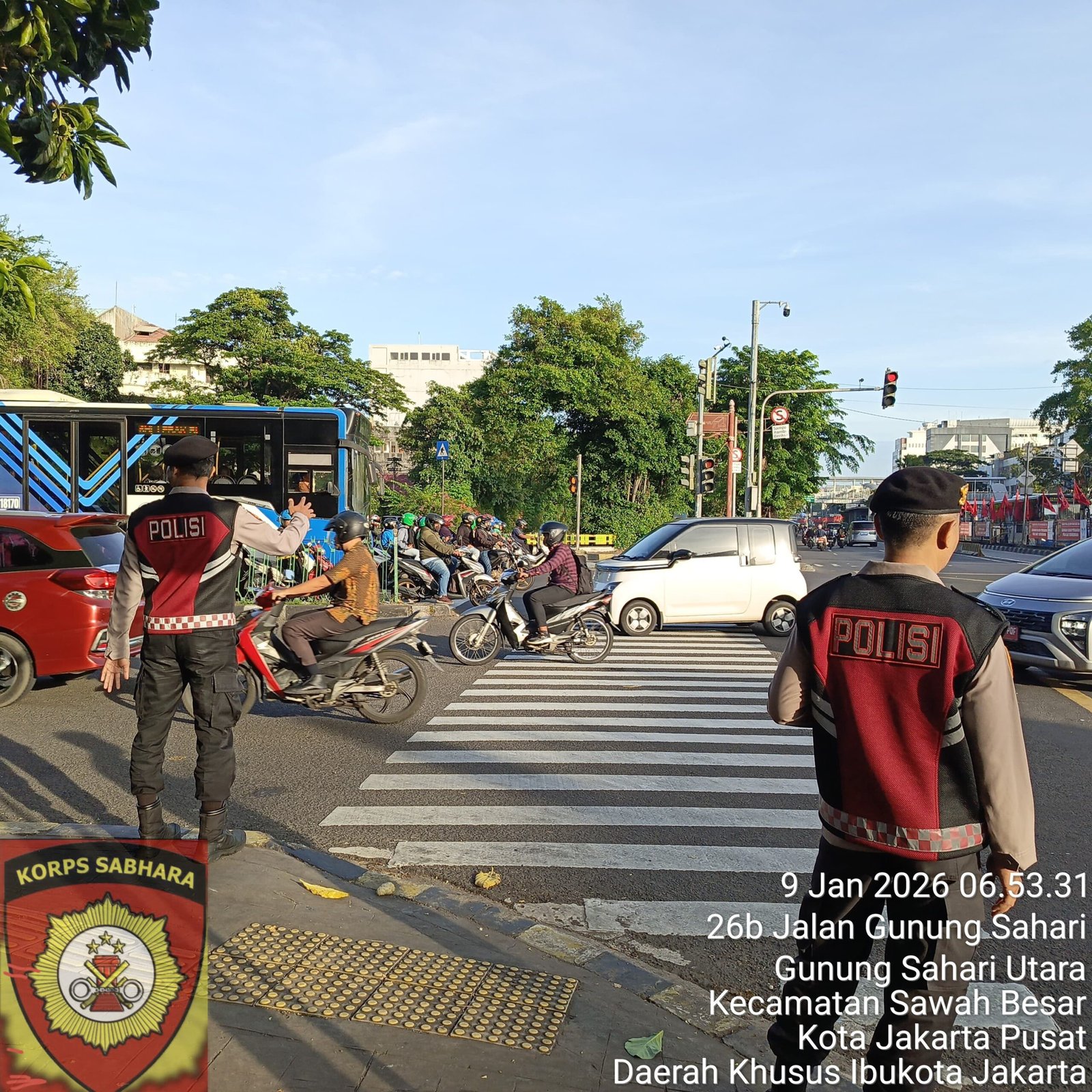 Harmoninews.com (Jakarta Pusat) — Polsek Sawah Besar melaksanakan pelayanan pagi hari melalui kegiatan pengaturan arus lalu lintas guna mencegah kemacetan dan pelanggaran di jam sibuk. Kegiatan ini dipimpin Panit Samapta Polsek Sawah Besar Aiptu Anwarudin bersama lima personel lainnya pada Jumat (9/1/2026) pukul 06.00 hingga 08.00 WIB di sejumlah titik strategis wilayah Sawah Besar, Jakarta Pusat.