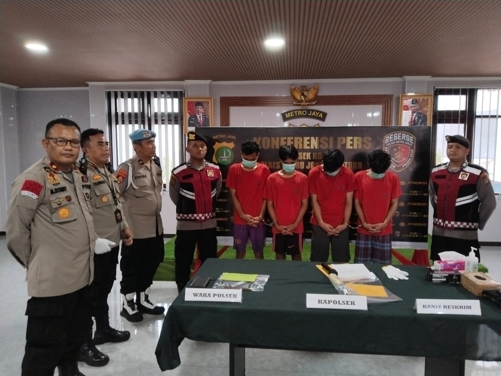 Dalam konferensi pers tersebut, Kompol Muhammad Syahroni menjelaskan bahwa pihaknya telah mengamankan tiga pemuda terkait kasus membawa senjata tajam dan satu pemuda terkait kasus pencurian handphone.