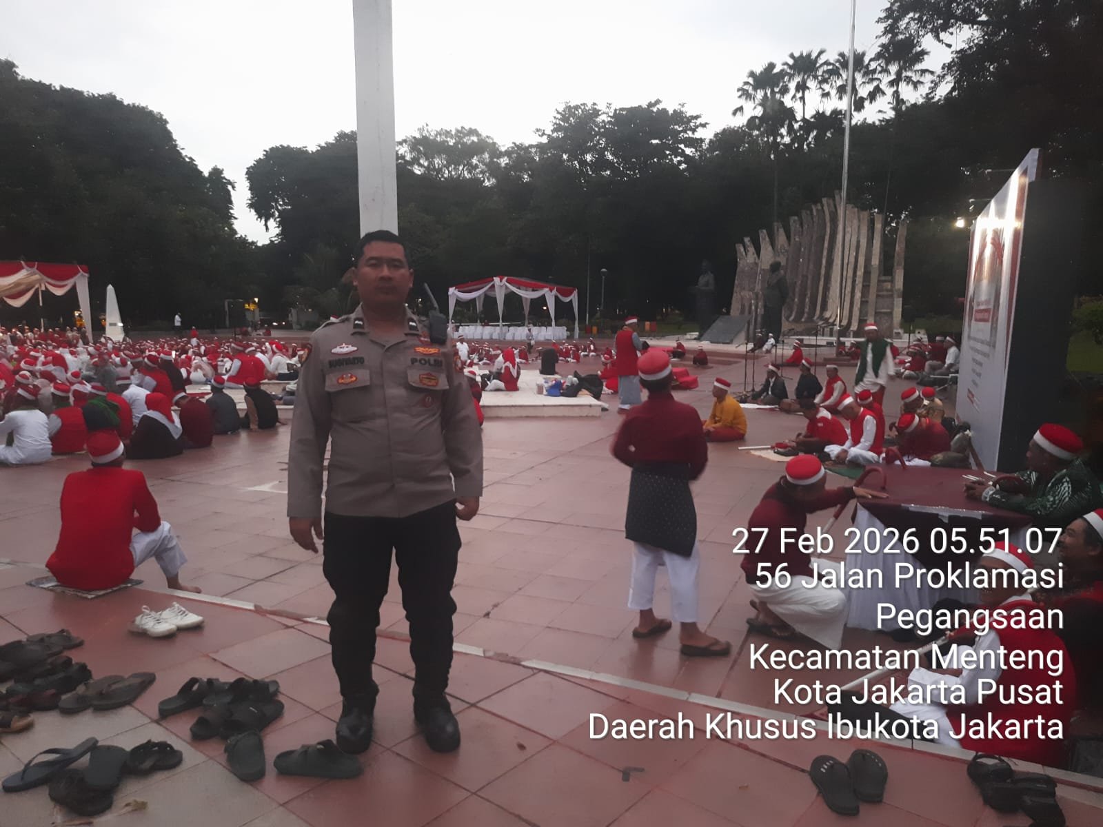 Harmoninews.com (Jakarta Pusat) – Polsek Metro Menteng melaksanakan kegiatan pengamanan Dzikir Nasional, Doa Bersama, serta Pengajian Anti Gempa Manaqib Tuan yang berlangsung khidmat di Tugu Proklamasi, Jalan Taman Proklamasi, Pegangsaan, Menteng, Jakarta Pusat. Kegiatan keagamaan berskala nasional ini diikuti sekitar 600 peserta yang datang dari berbagai daerah, antara lain Jawa Barat, Jawa Tengah, dan Lampung. Jumat (27/2/2026)