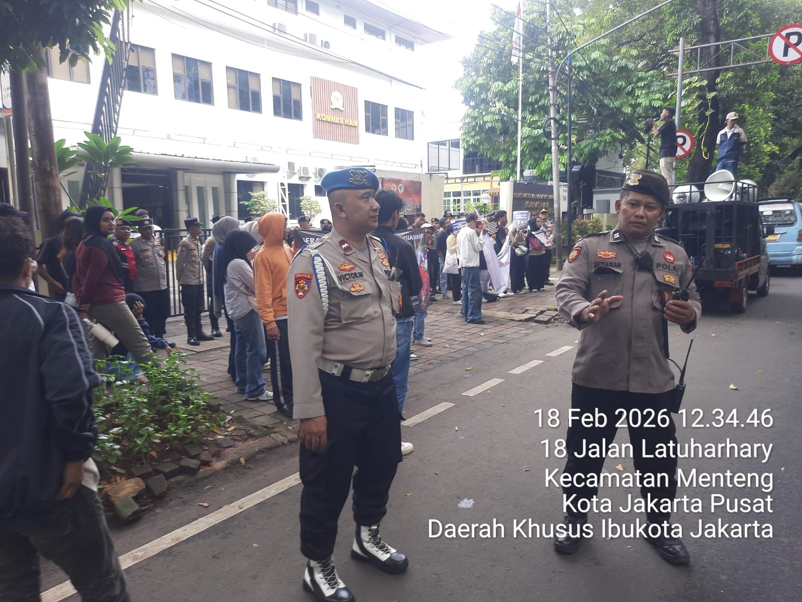 Harmoninews.com (Jakarta Pusat) – Polsek Metro Menteng melaksanakan kegiatan pelayanan pengamanan aksi unjuk rasa yang berlangsung di kantor Komisi Nasional Hak Asasi Manusia Republik Indonesia (Komnas HAM RI), Jalan Latuharhari No. 4B, Menteng, Jakarta Pusat, pada hari ini. Kegiatan tersebut merupakan bentuk komitmen Polri dalam memberikan pelayanan dan pengamanan kepada masyarakat agar penyampaian pendapat di muka umum dapat berjalan aman, tertib, dan kondusif. Rabu (18/2/2026)