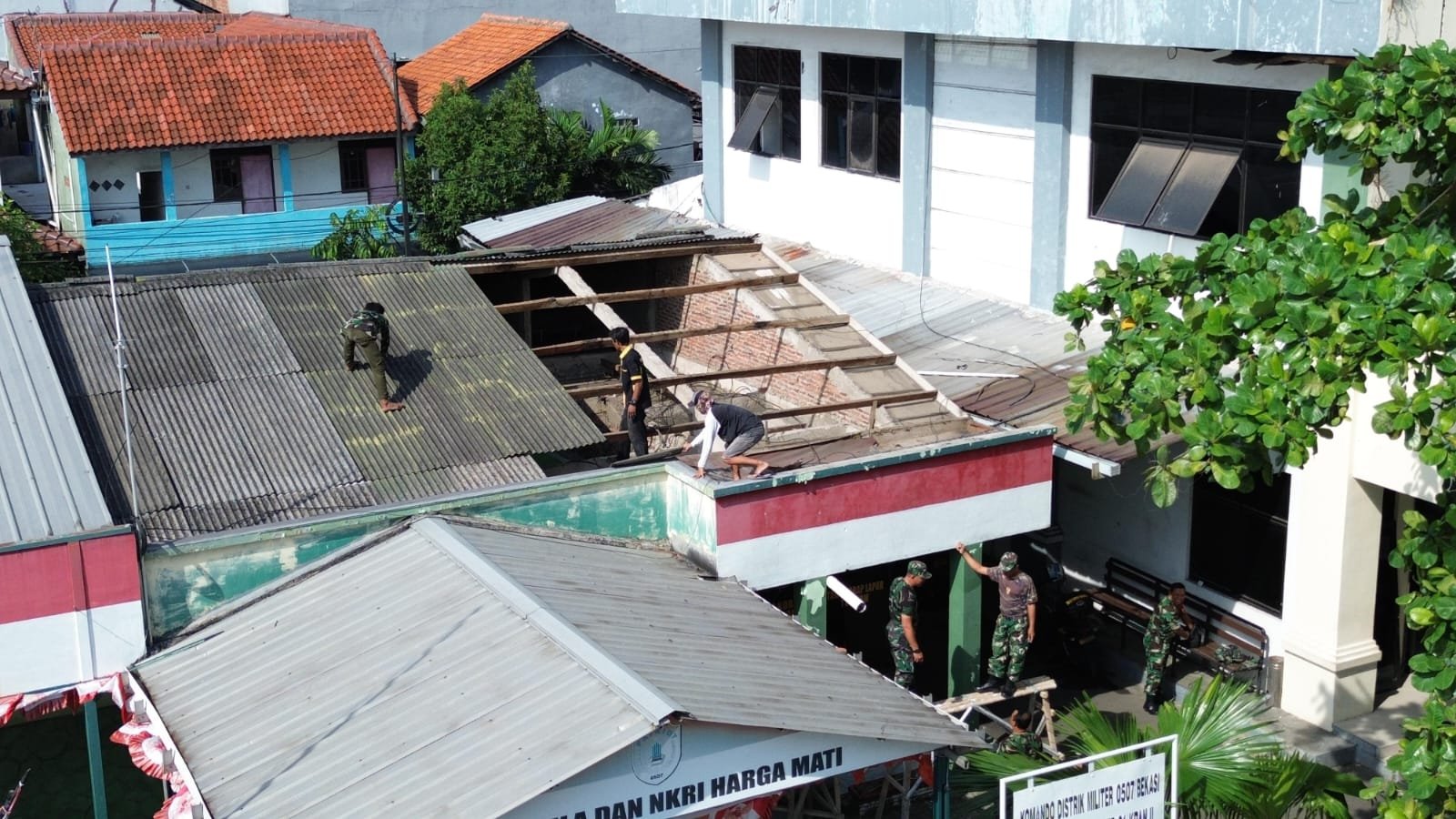 Danramil 01/Kranji Mayor Inf Taufik Ismail tampak turun langsung memimpin jalannya pembongkaran. Dengan mengenakan pakaian dinas lapangan, ia tak segan ikut memindahkan puing dan membersihkan sisa asbes atap bersama anggotanya.